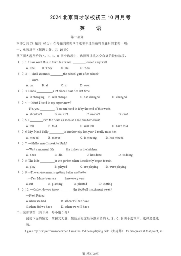 北京2024.10各个学校月考正在陆续进行中,为方便大家对答案、下载练习等小编给大家搜集了2024北京育才学校初三10月月考英语试题及答案,需要的小伙伴赶紧下载练习起来吧: