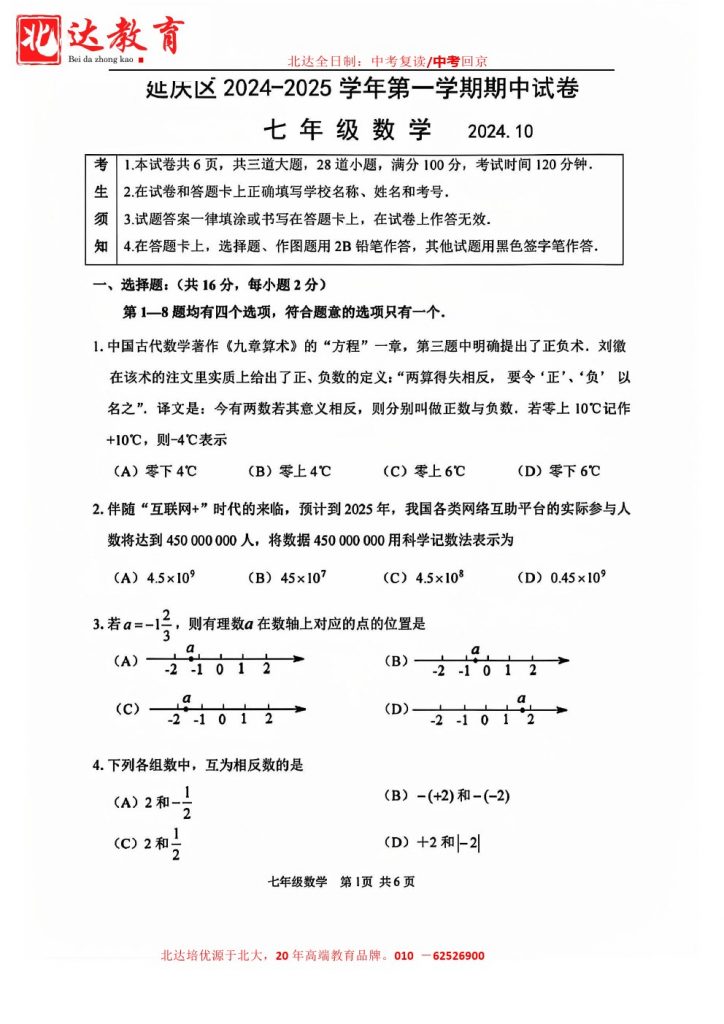 北京2024-2025学年期中考试正在陆续进行中,为方便大家对答案、下载练习等小编给大家搜集了2024北京延庆区初一(上)期中数学试题,需要的小伙伴赶紧下载练习起来吧: