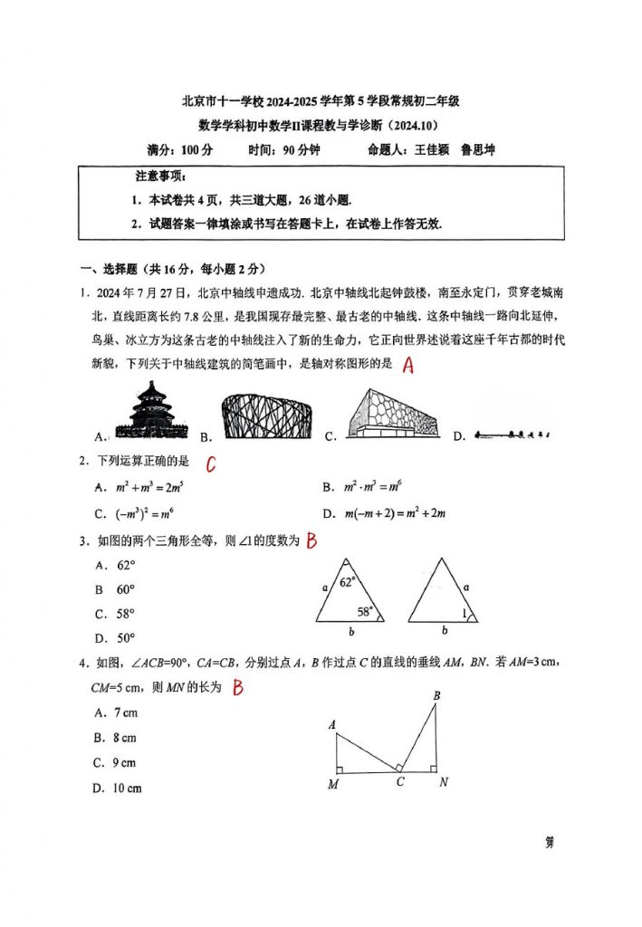 北京2024-2025学年期中考试正在陆续进行中,为方便大家对答案、下载练习等小编给大家搜集了2024北京十一学校初二(上)期中联考数学试卷(含手写答案),需要的小伙伴赶紧下载练习起来吧: