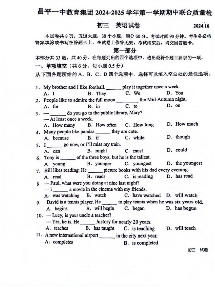 北京2024-2025学年期中考试正在陆续进行中,为方便大家对答案、下载练习等小编给大家搜集了2024北京昌平一中初三(上)期中英语试题,需要的小伙伴赶紧下载练习起来吧: