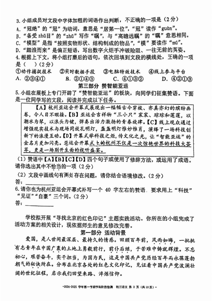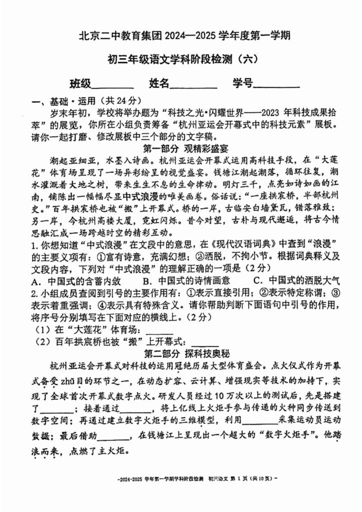 北京2024-2025学年期中考试正在陆续进行中,为方便大家对答案、下载练习等小编给大家搜集了2024北京二中初三(上)期中语文试题,需要的小伙伴赶紧下载练习起来吧: 试题预览: …