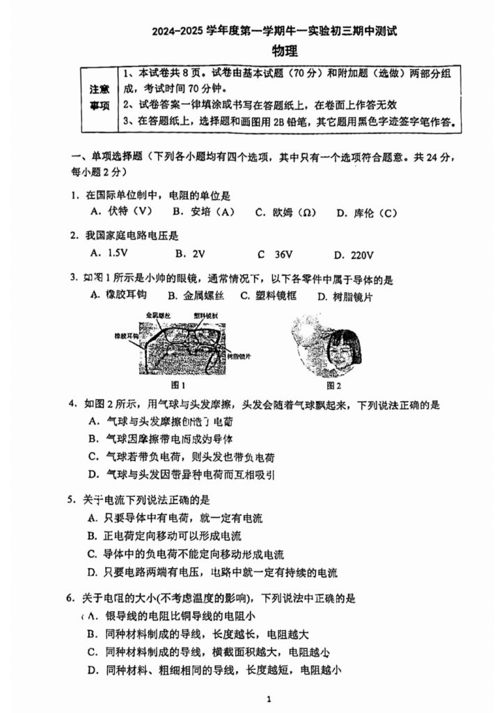 北京2024-2025学年期中考试正在陆续进行中,为方便大家对答案、下载练习等小编给大家搜集了2024北京牛栏山一中实验学校初三(上)期中物理试题,需要的小伙伴赶紧下载练习起来吧:…