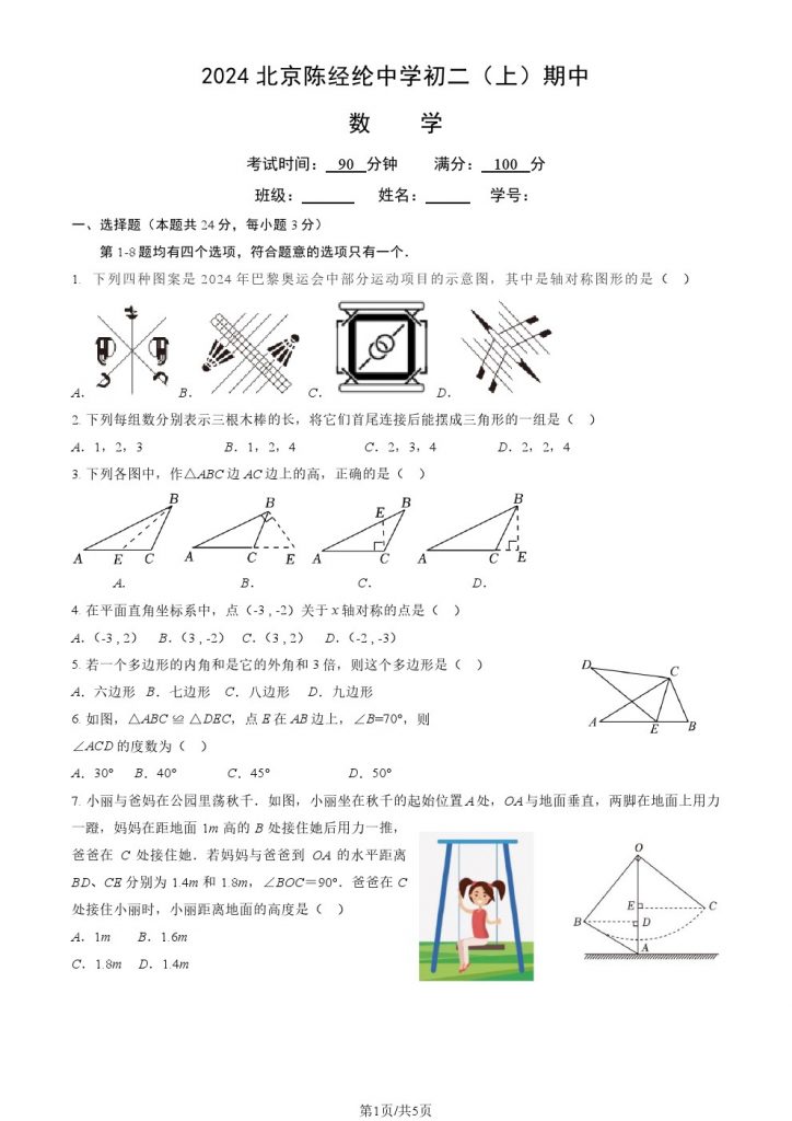 北京2024-2025学年期中考试正在陆续进行中,为方便大家对答案、下载练习等小编给大家搜集了2024北京陈经纶初二(上)期中数学试题,需要的小伙伴赶紧下载练习起来吧:
