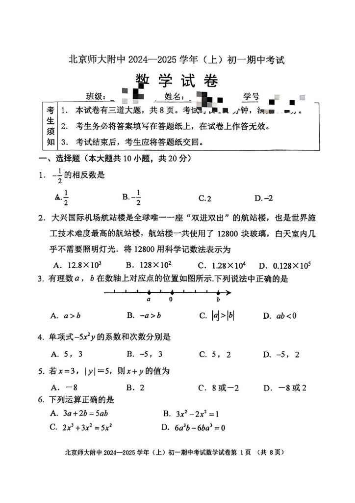 北京2024-2025学年期中考试正在陆续进行中,为方便大家对答案、下载练习等小编给大家搜集了2024北京北师大附中初一(上)期中数学试题,需要的小伙伴赶紧下载练习起来吧: