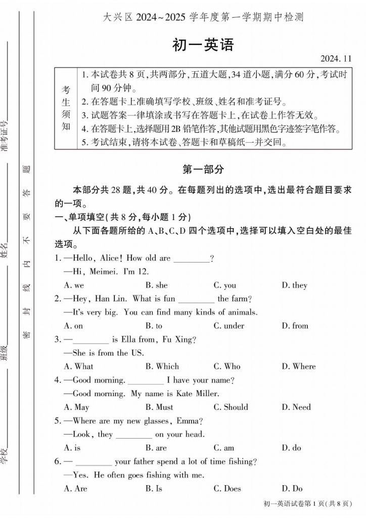 北京2024-2025学年期中考试正在陆续进行中,为方便大家对答案、下载练习等小编给大家搜集了2024北京大兴初一(上)期中英语试题及答案,需要的小伙伴赶紧下载练习起来吧: