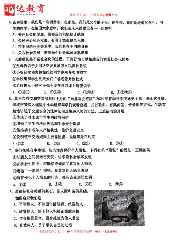 北京2024-2025学年期中考试正在陆续进行中,为方便大家对答案、下载练习等小编给大家搜集了2024北京十四中初二(上)期中道法试题及答案,需要的小伙伴赶紧下载练习起来吧: