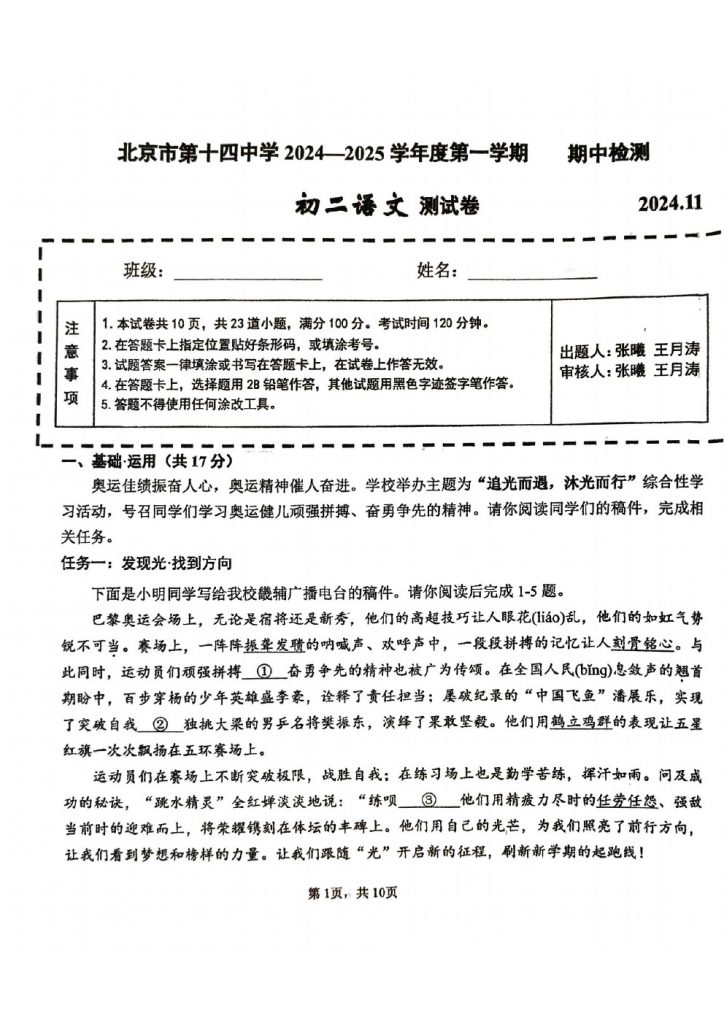 北京2024-2025学年期中考试正在陆续进行中,为方便大家对答案、下载练习等小编给大家搜集了2024北京十四中初二(上)期中语文试题,需要的小伙伴赶紧下载练习起来吧: