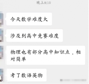 主要考了语文、数学、英语和物理,一共5个小时。数学考了70分钟,一共16道题,14道填空,2道代数大题,还是非常不简单的。语文考了60分钟,议论文阅读理解,据说篇幅很长,还有文言文阅读,也比较难。还有古诗文及成语基础,最后是一共150字的议论文写作。英语差不多考了40分钟,26个单选,10个完形、3篇阅读,据说又长又难,还有7选五5句子填空。物理考了60分钟,填空、选择、大题、实验、题量比较大。