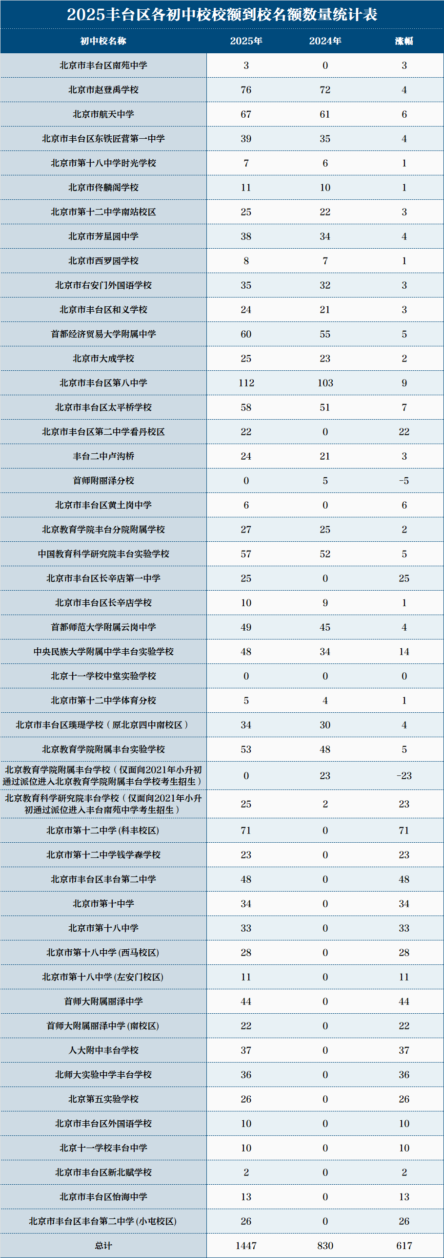 近期,也有热心家长分享了丰台区各初中校2025年中考享有的校额到校数量,2024年丰台区校额到校总名额为830个,2025年增长到1447个,净增长617个名额,增幅达74.3%,…