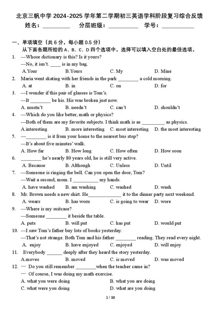 admw360教研组收集整理了三帆中学2025初三零模英语试题及答案,分享给大家,快来下载复习吧。 北京admw360全日制学校,中高考复读,外地回京中高考 电话咨询:400-6168182 010-…