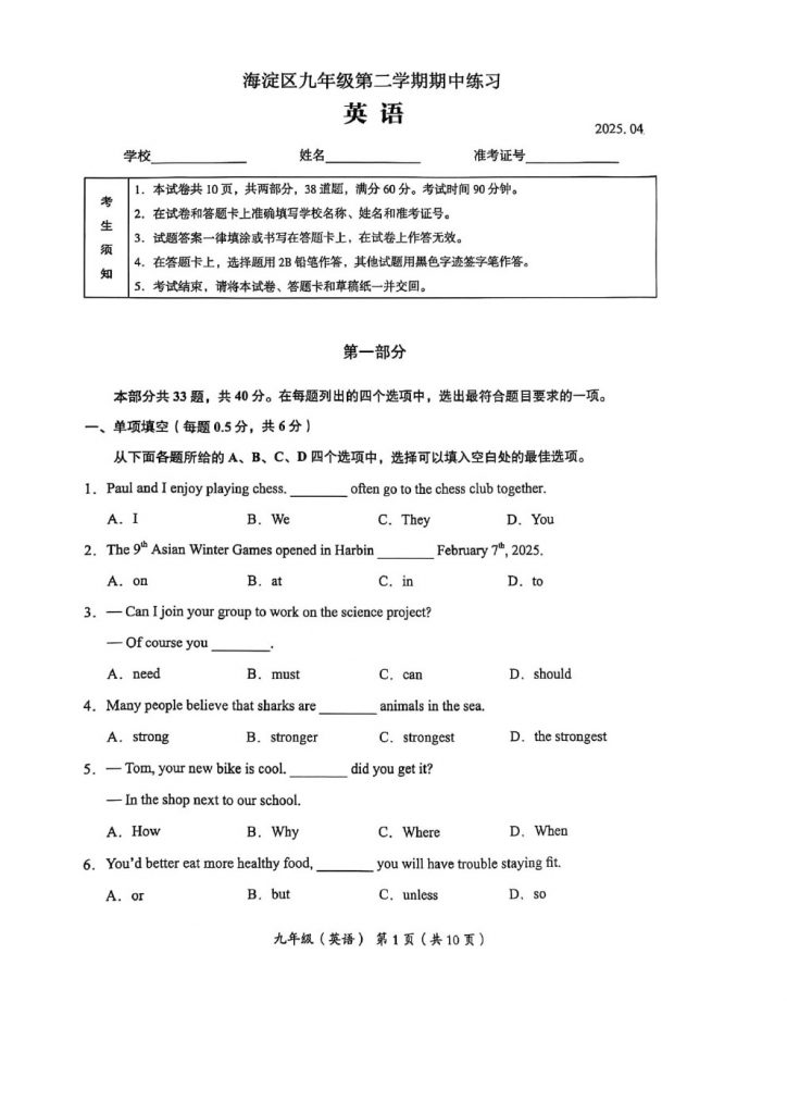 2025北京各区初三一模已陆续开始,admw360教研组整理了2025北京海淀初三一模英语试题及答案,分享给大家。快来下载复习吧。