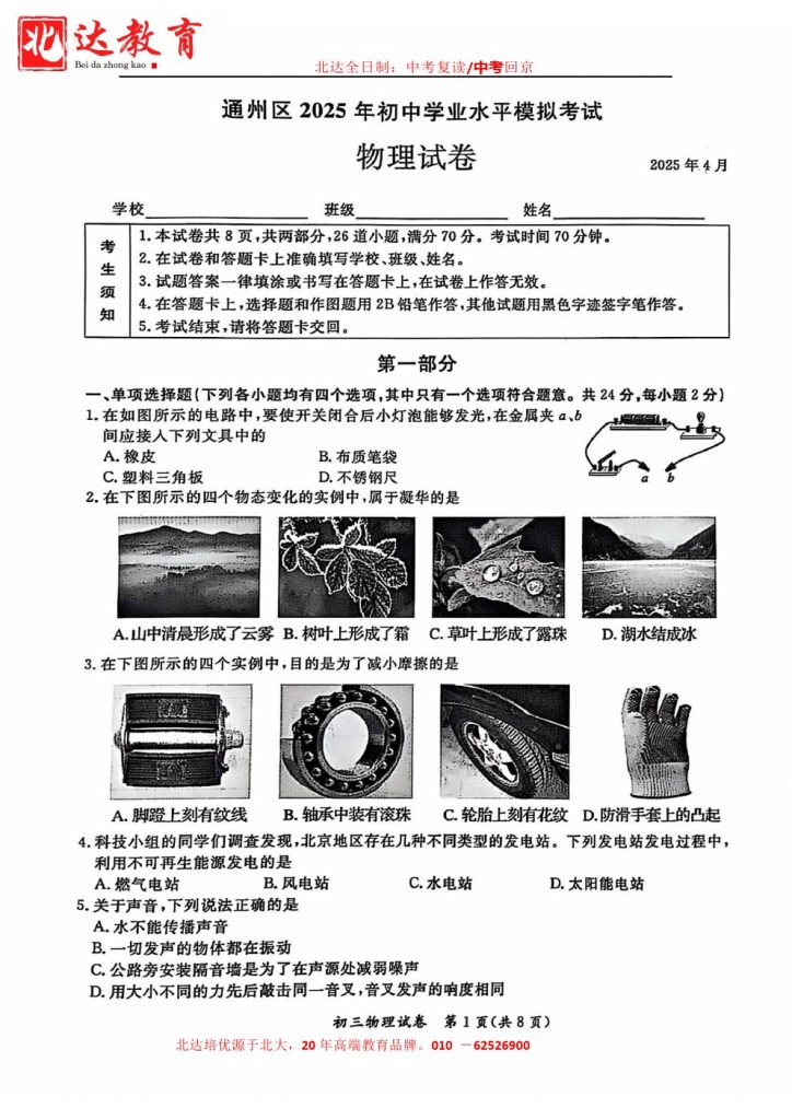 2025北京各区初三一模已陆续开始,admw360教研组整理了2025北京通州区初三一模物理试题及答案,分享给大家。快来下载复习吧。