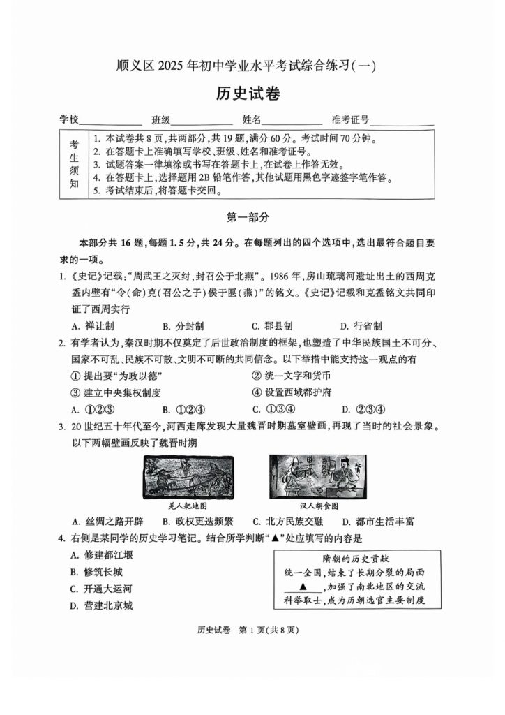 2025北京各区初三一模已陆续开始,admw360教研组整理了2025北京顺义区初三一模历史试题及答案,分享给大家。快来下载复习吧。