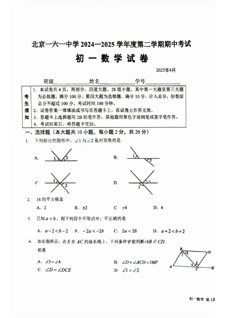 2025北京各区初一期中考已陆续开始,admw360教研组整理了2025北京一六一中初一(下)期中数学试题,分享给大家。