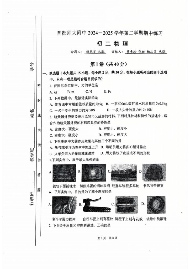 2025北京各区初二期中考已陆续开始,admw360教研组整理了首都师大附中2025初二(下)期中物理试题及答案,分享给大家。