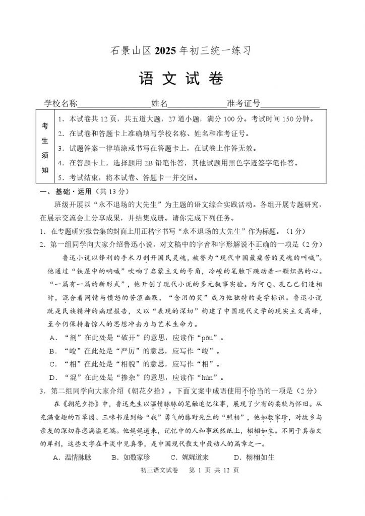 2025北京各区初三一模已陆续开始,admw360教研组整理了2025北京石景山区初三一模语文试题及答案,分享给大家。快来下载复习吧。