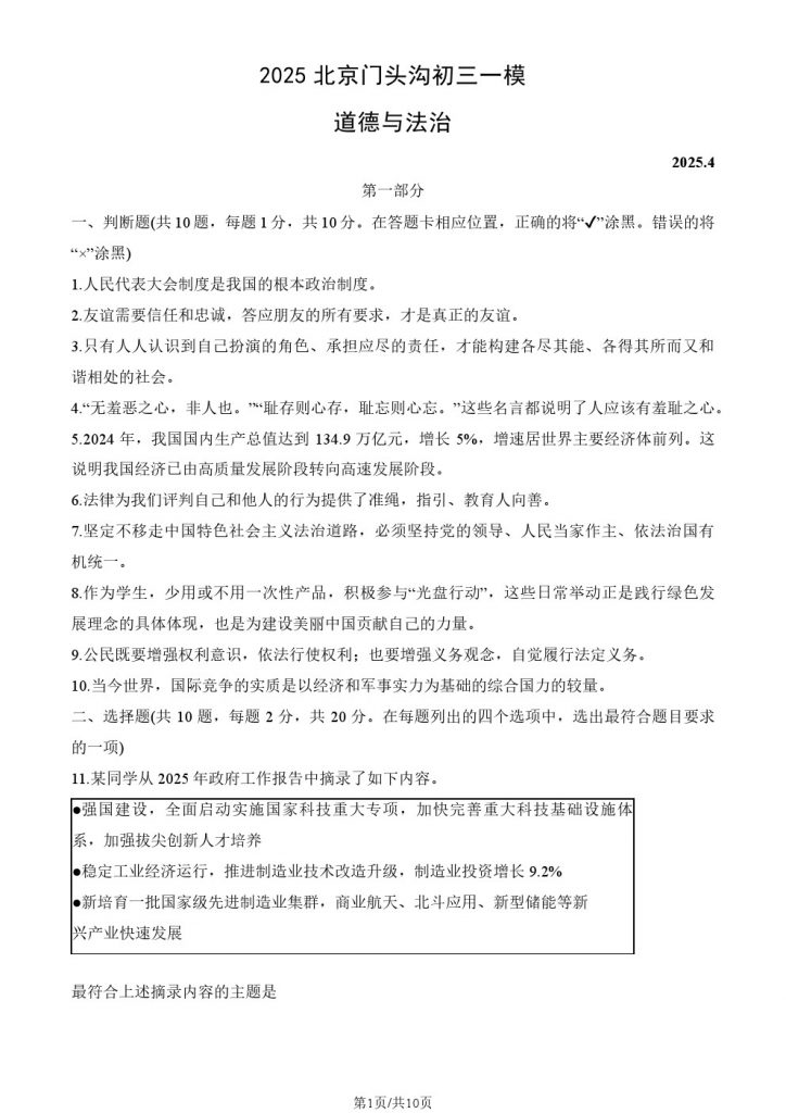2025北京各区初三一模已陆续开始,admw360教研组整理了2025北京门头沟初三一模道德与法治试题及答案,分享给大家。快来下载复习吧。
