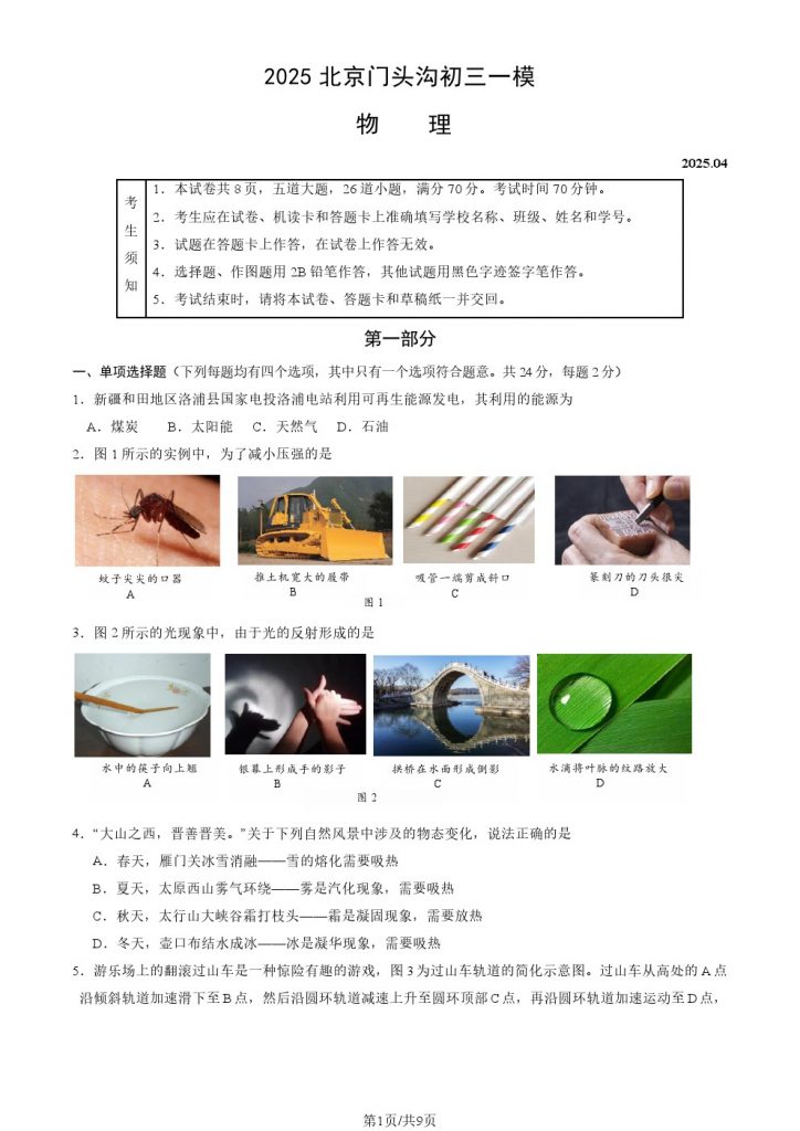 2025北京各区初三一模已陆续开始,admw360教研组整理了2025北京门头沟区初三一模物理试题及答案,分享给大家。快来下载复习吧。