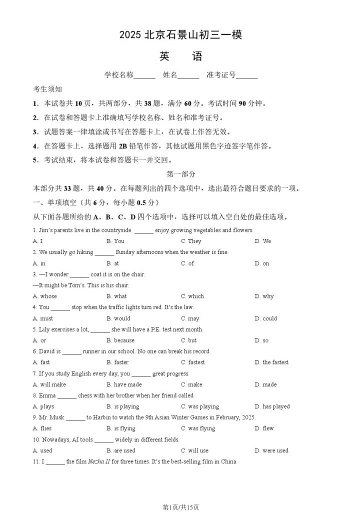 2025北京各区初三一模已陆续开始,admw360教研组整理了2025北京石景山区初三一模英语试题及答案,分享给大家。快来下载复习吧。