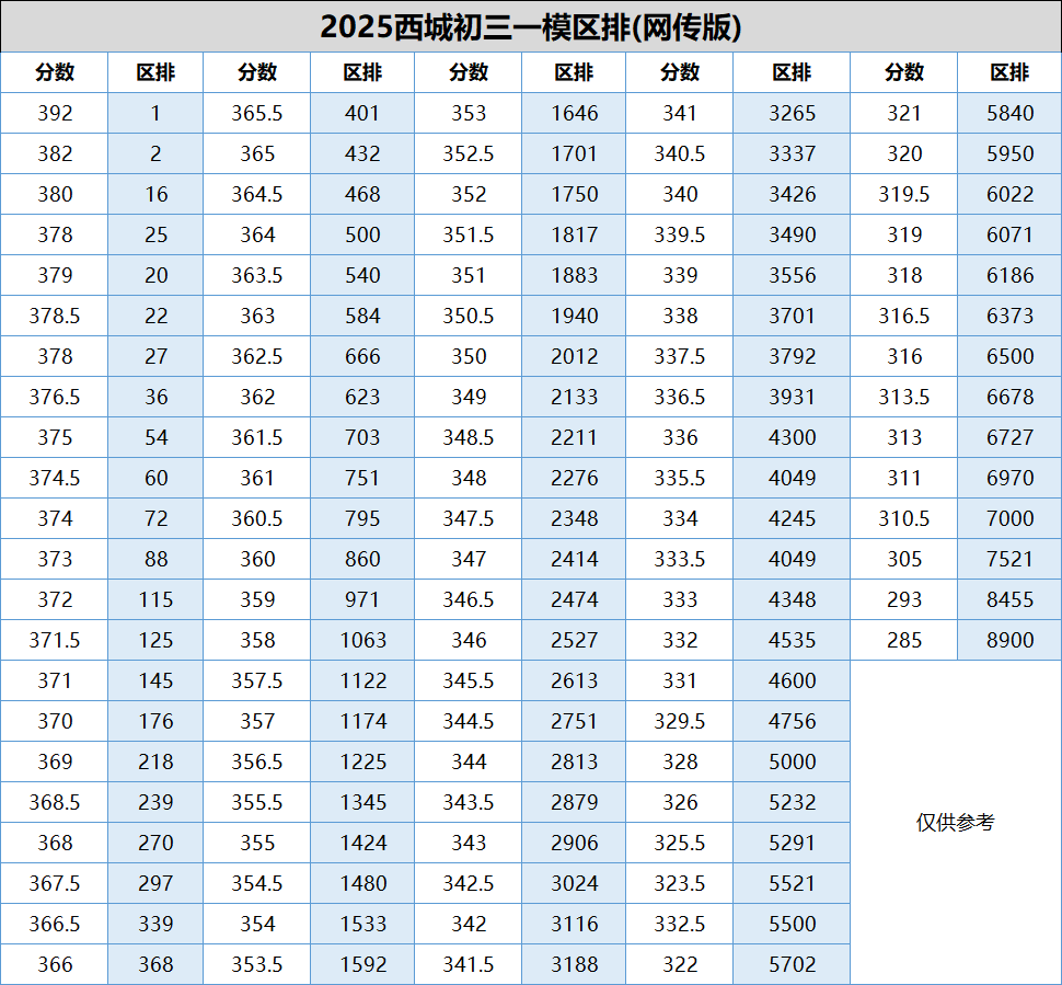 ②2025年西城区初三一模有11403人参与排名(不含直升),总分400分。380分以上有19人,据说西城区第一为392分,来自华夏女中。