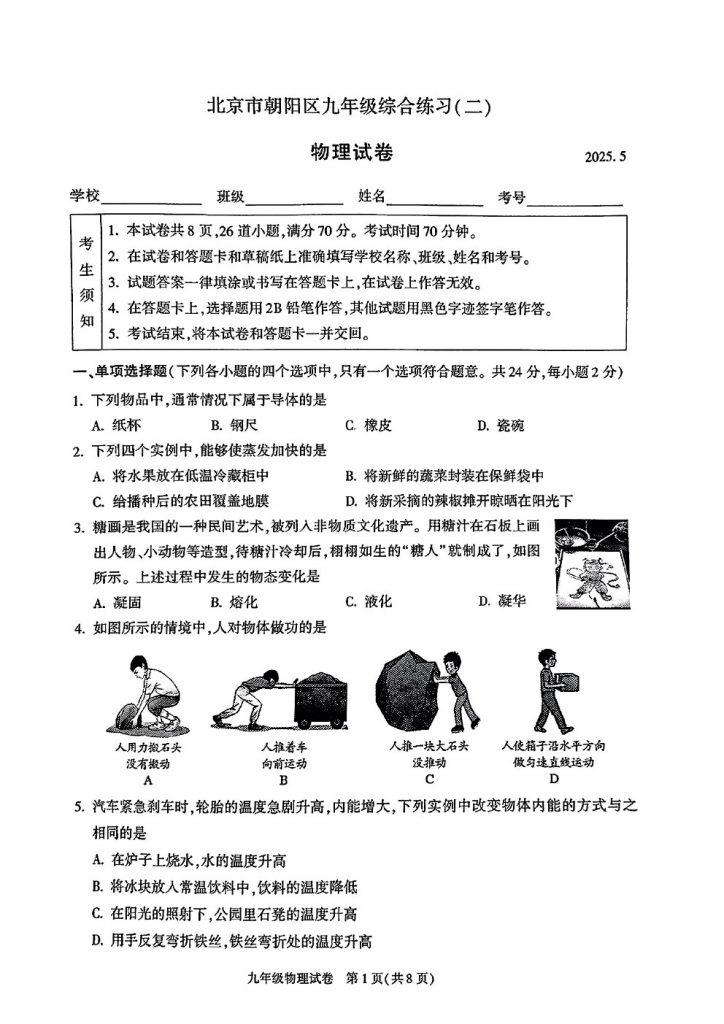首页 初三试题 2025北京朝阳区初三二模物理试题及答案