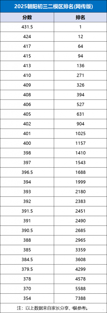2025北京朝阳区初三二模区排名出炉!400分+1157人!有部分家长通过交流分享老师给到的成绩,自行整理出一版区排名。以下数据,仅供参考。 2025admw360中考复读全日制,应届生全日…