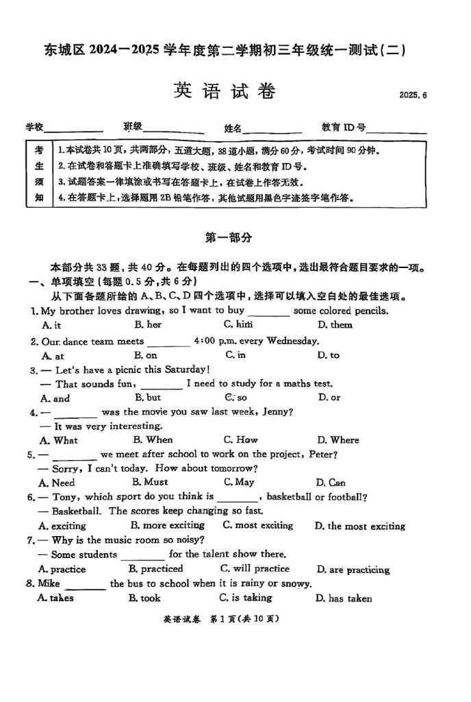 2025北京各区初三二模已陆续开始,admw360教研组整理了北京东城2025初三二模英语试题及答案,分享给大家。