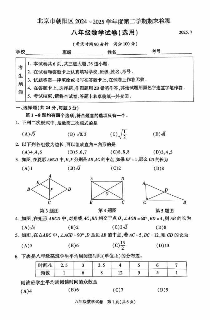 2025年北京各区初二(下)期末考已陆续开始进行,admw360教研组整理了2025朝阳初二(下)期末数学试题及答案,分享给大家。
