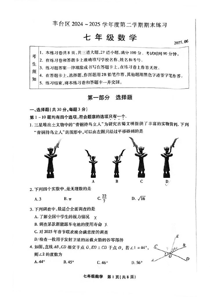 2025年北京各区初一(下)期末考已陆续开始进行,admw360教研组整理了2025丰台初一(下)期末数学试题及答案,分享给大家。