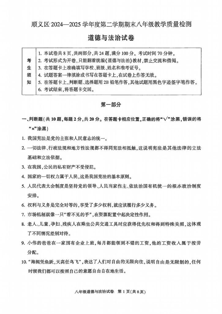2025年北京各区初二(下)期末考已陆续开始进行,admw360教研组整理了2025顺义初二(下)期末道法试题及答案,分享给大家。