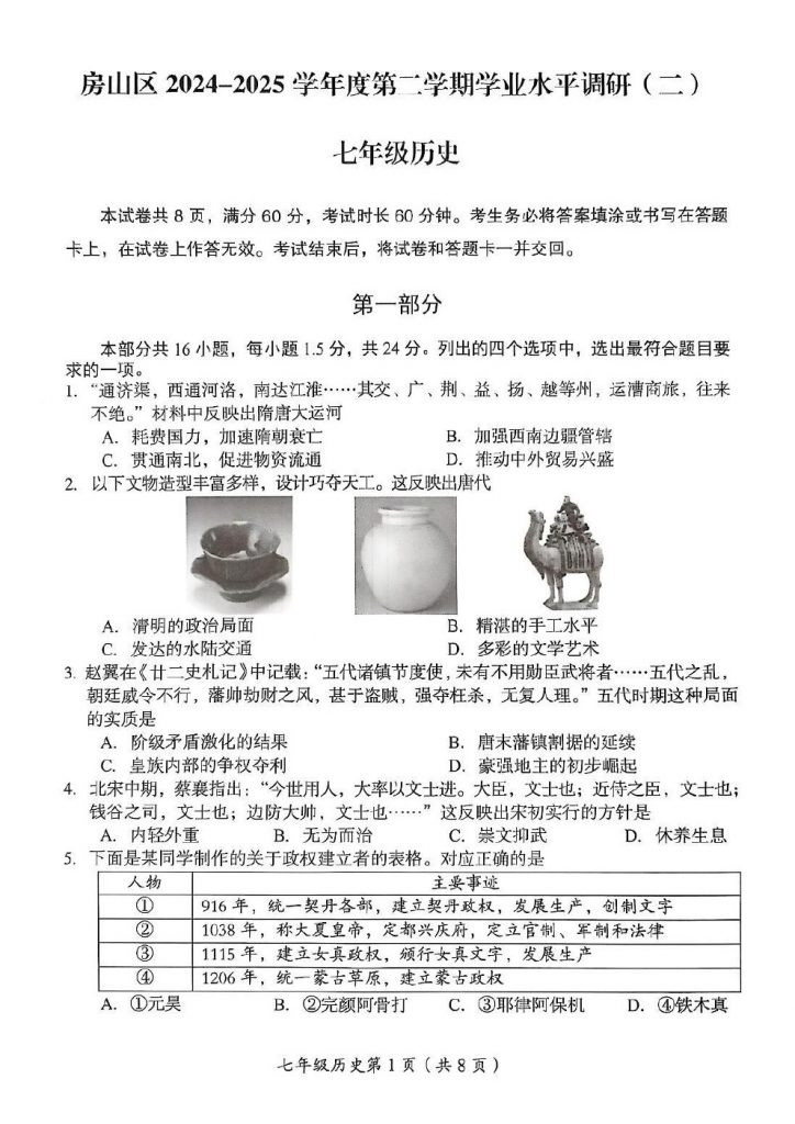 2025年北京各区初一(下)期末考已陆续开始进行,admw360教研组整理了2025北京房山初一(下)期末历史试题,分享给大家。
