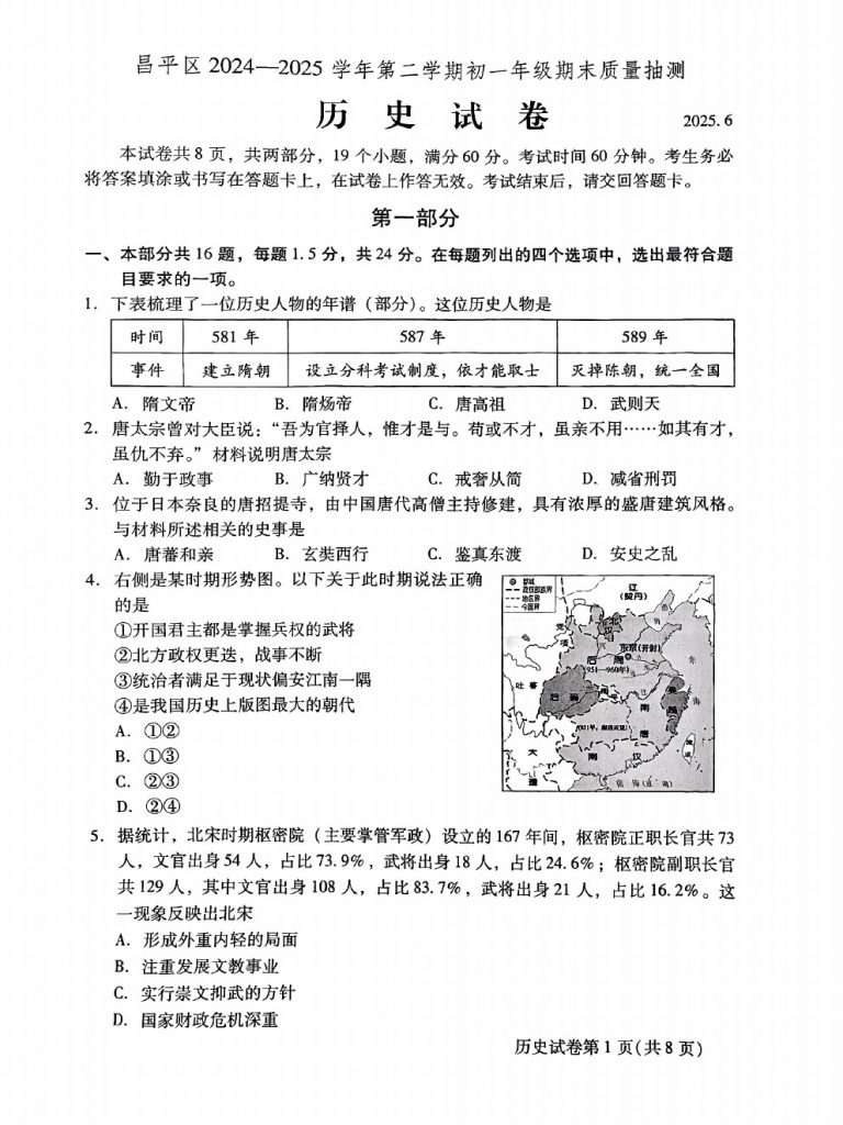 2025年北京各区初一(下)期末考已陆续开始进行,admw360教研组整理了2025北京昌平初一(下)期末历史试题,分享给大家。