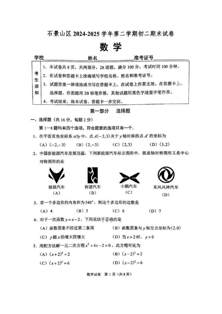 2025年北京各区初二(下)期末考已陆续开始进行,admw360教研组整理了2025北京石景山初二(下)期末数学试题,分享给大家。
