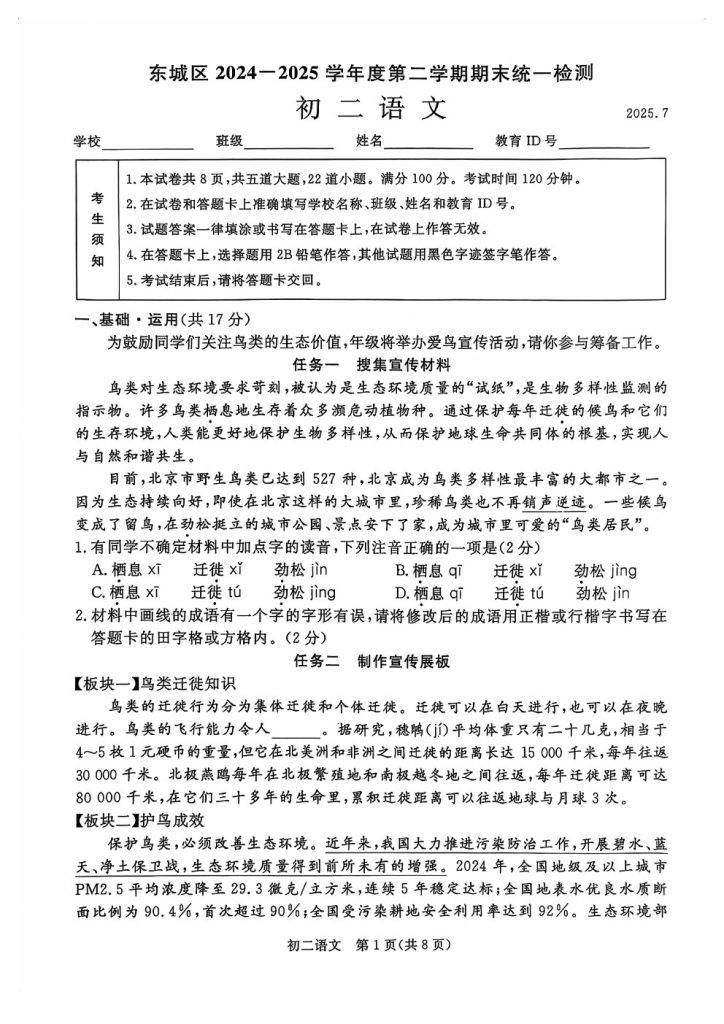 2025年北京各区初二(下)期末考已陆续开始进行,admw360教研组整理了2025北京东城初二(下)期末语文试题及答案,分享给大家。