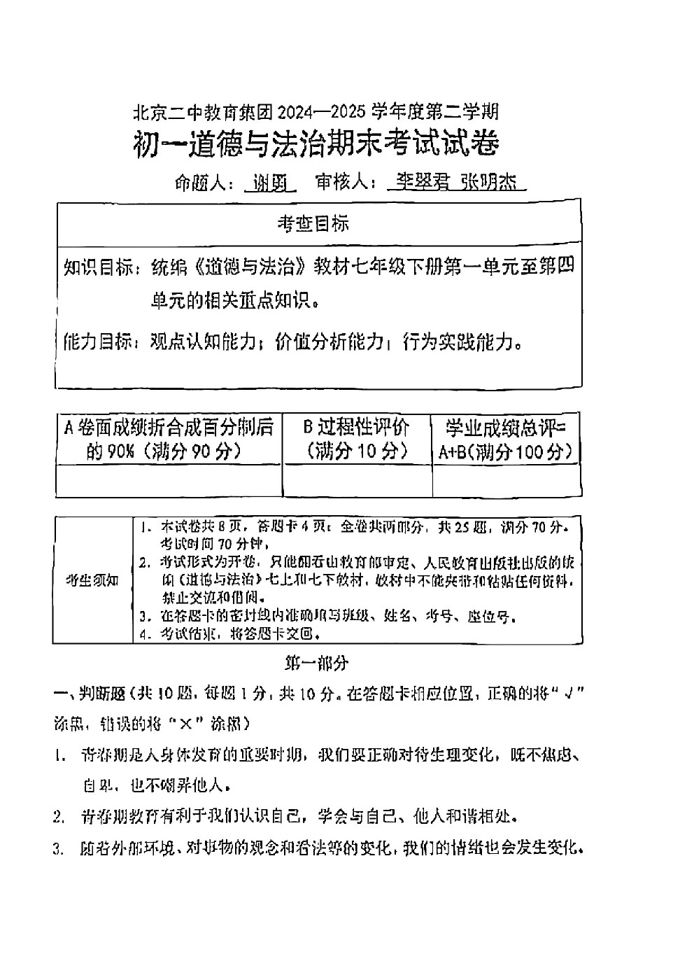 2025年北京各区初一(下)期末考已陆续开始进行,admw360教研组整理了2025北京二中初一(下)期末道法试题及答案,分享给大家。