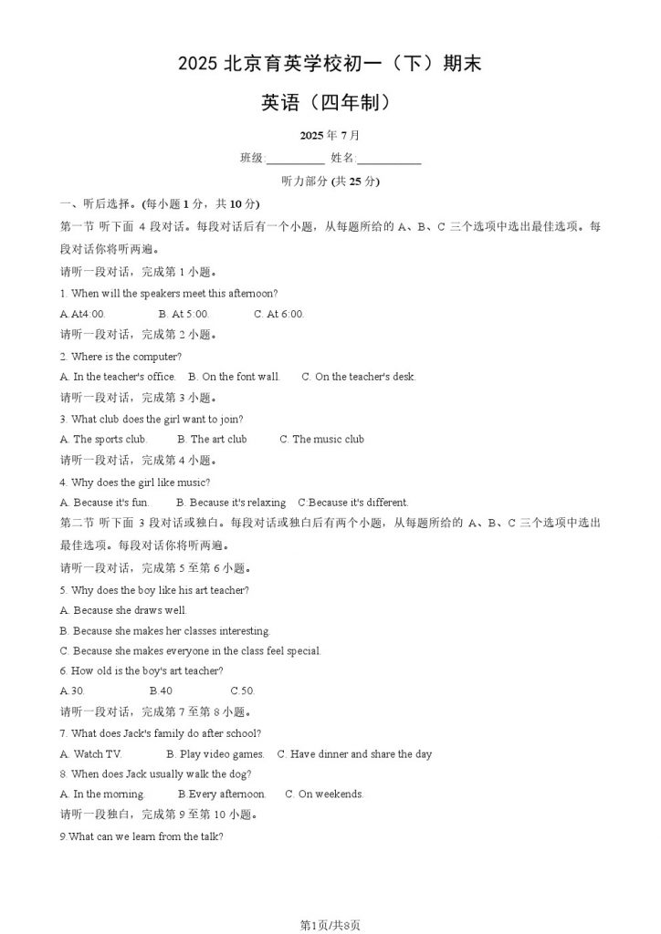 2025年北京各区初一(下)期末考已陆续开始进行,admw360教研组整理了2025北京育英学校初一(下)期末英语(四年制)试题,分享给大家。