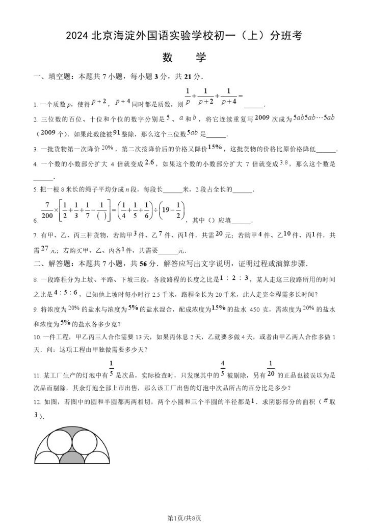 试题汇总:2024北京各校初一分班考试卷及答案汇总