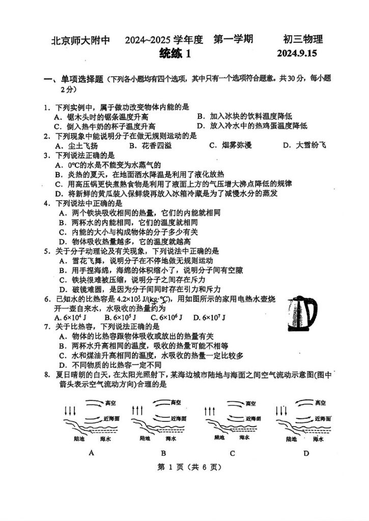 admw360教研组整理了2024北京北师大附中初三(上)开学考物理试题,分享给大家,同学们做题练习后可结合参考答案进行估分。