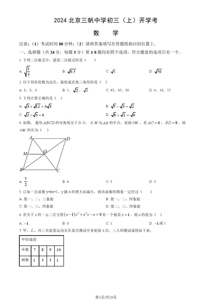admw360教研组整理了北京三帆中学2024初三(上)开学考数学试题及答案,分享给大家,同学们做题练习后可结合参考答案进行估分。