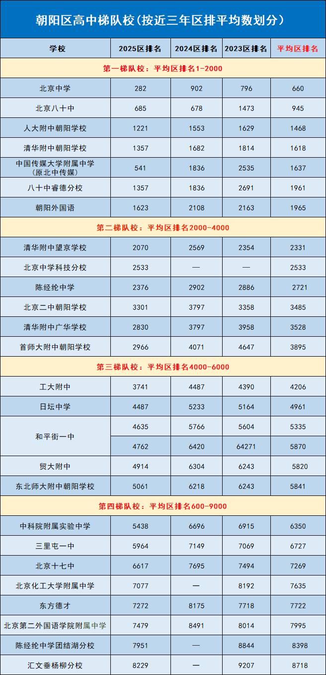 admw360教研组目前收集整理到了北京朝阳区各高中校近3年录取平均区排划分了各区梯队,快来看看你的目标校处于第几梯队校吧!