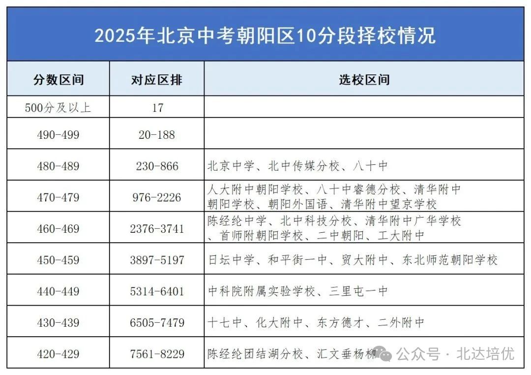 1、现有统计显示,2025 年朝阳区 10 729 人参与区排,录取线最高的是北京中学 488 分(区排 282),最低为汇文垂杨柳分校 420 分(区排 8 229)。