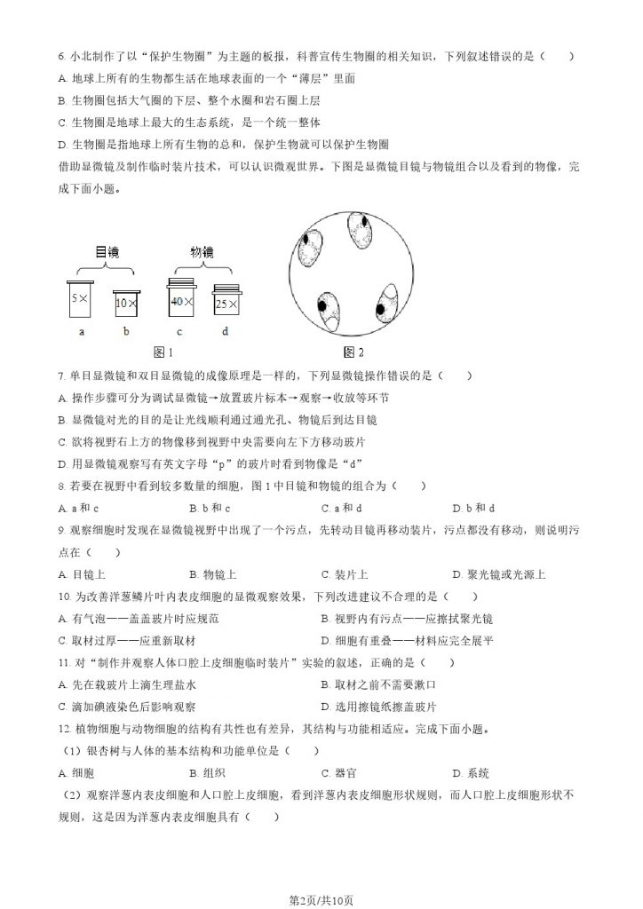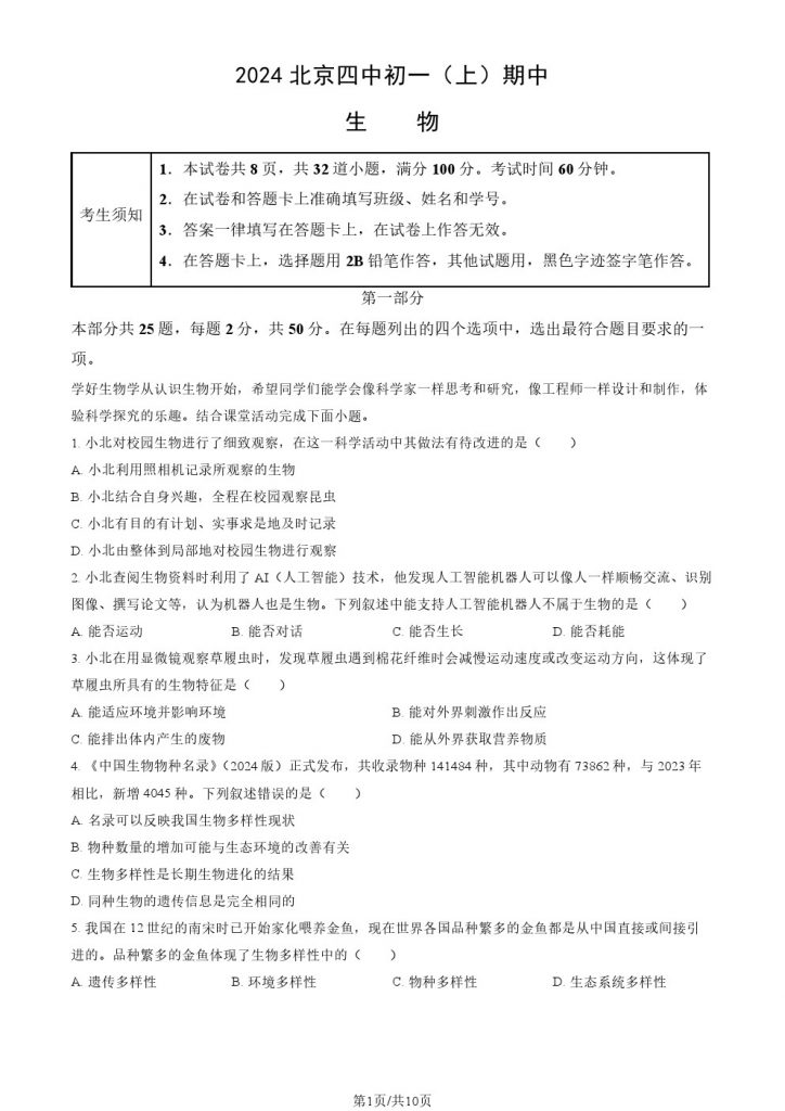 为方便大家对答案、下载练习等小编整理了2024北京四中初一(上)期中生物试题及答案,需要的小伙伴赶紧下载练习起来吧: