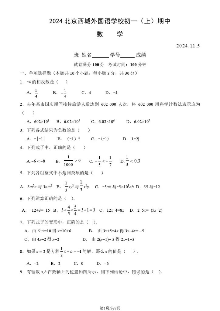 首页 初一试题 2024北京西城外国语学校初一(上)期中数学试题及答案