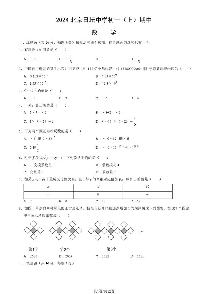 为方便大家对答案、下载练习等小编整理了2024北京日坛中学初一(上)期中数学试题及答案,需要的小伙伴赶紧下载练习起来吧:
