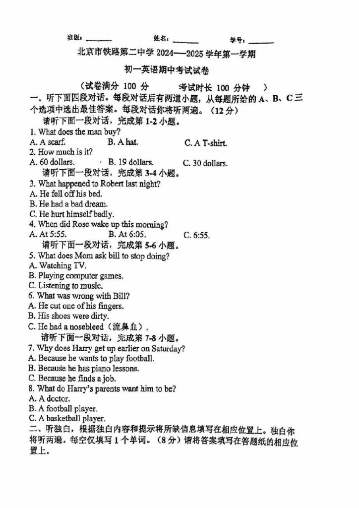 为方便大家对答案、下载练习等小编整理了2024北京铁二中初一(上)期中英语试题及答案,需要的小伙伴赶紧下载练习起来吧: