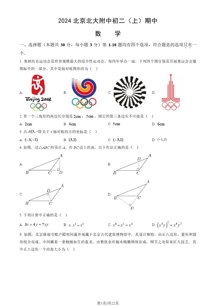 为方便大家对答案、下载练习等小编给大家搜集了2024北京北大附中初二(上)期中数学试题及答案,需要的小伙伴赶紧下载练习起来吧: