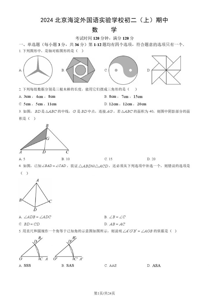 为方便大家对答案、下载练习等小编给大家搜集了2024北京海淀外国语实验学校初二(上)期中数学试题及答案,需要的小伙伴赶紧下载练习起来吧: