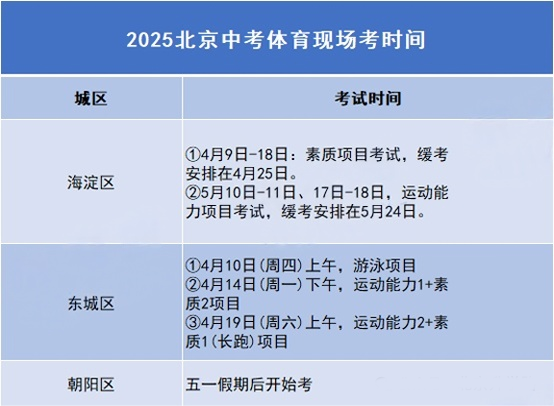 目前,我们收集到了海淀、东城、朝阳3区中考体育现场考的时间,如果您了解其他区体育现场考时间,欢迎留言区分享交流~