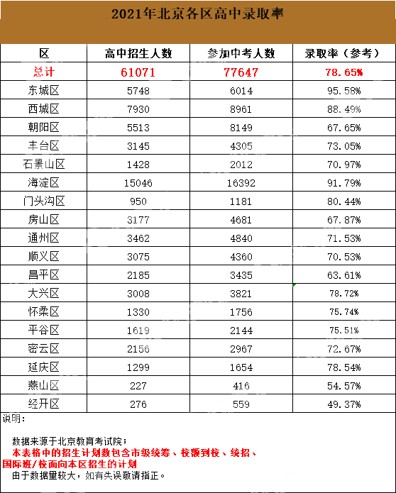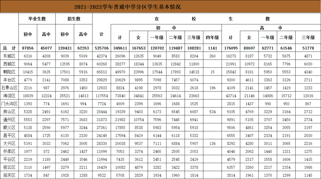 在校生数量包括非京籍考生,不包括外省回京考生,下面所出示的相关数据不能代表2022年实际的中考人数,要以实际报名中考学生为准。