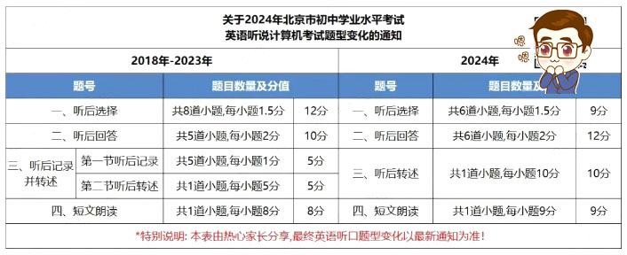 根据热心家长分享的英语听说题型变化,2024届英语听说机考仍有4大题型,且满分仍为40分,变化的是↓